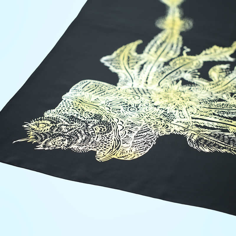 GINZA SIX 限定品の「美しい羽 02 GINZA MADARA」は、小松さんにとっても生地から選定し染付まで行った初めてのファブリックアートです。