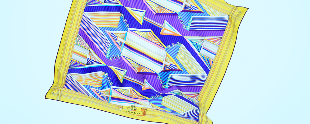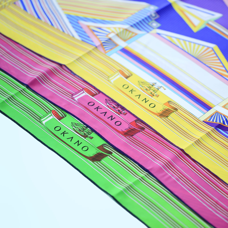 中でも1献のカラーは、光沢の美しいサテンクレープとも相まって鮮やかな発色が特徴的。納得の色ができるまで何度も工房に足を運びたどり着けた発色です。直線だけのデザインを12版の色を重ねて手捺染で染める技術は、0.1mmの調整を繰り返して実現される緻密な職人技です。これまでの常識を乗り越えて到達できたOKANOを代表するシリーズです。