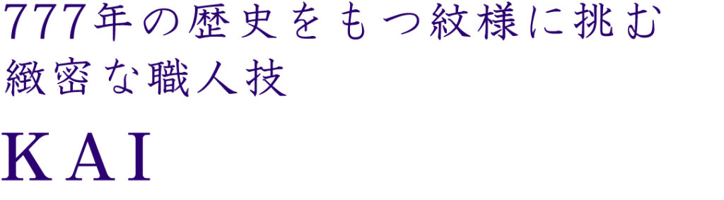 KAI(回)は、独鈷という密教の法具をコロコロと回転させてできる博多織の紋様(独鈷華皿紋様)から名付けられました。独鈷の回転紋様は、「廻りて回る輪廻転生」のメッセージとされ、770年以上の歴史を持つ世界でも珍しい紋様です。その紋様、現在では献上柄と呼ばれています。由来は1600年に黒田藩から徳川幕府への献上品として定められたことによります。博多織の帯は締まりが良く、堅牢なため、武士の命より大切な刀をさすには最適な帯として江戸で人気を誇り「献上博多」の名が広められました。