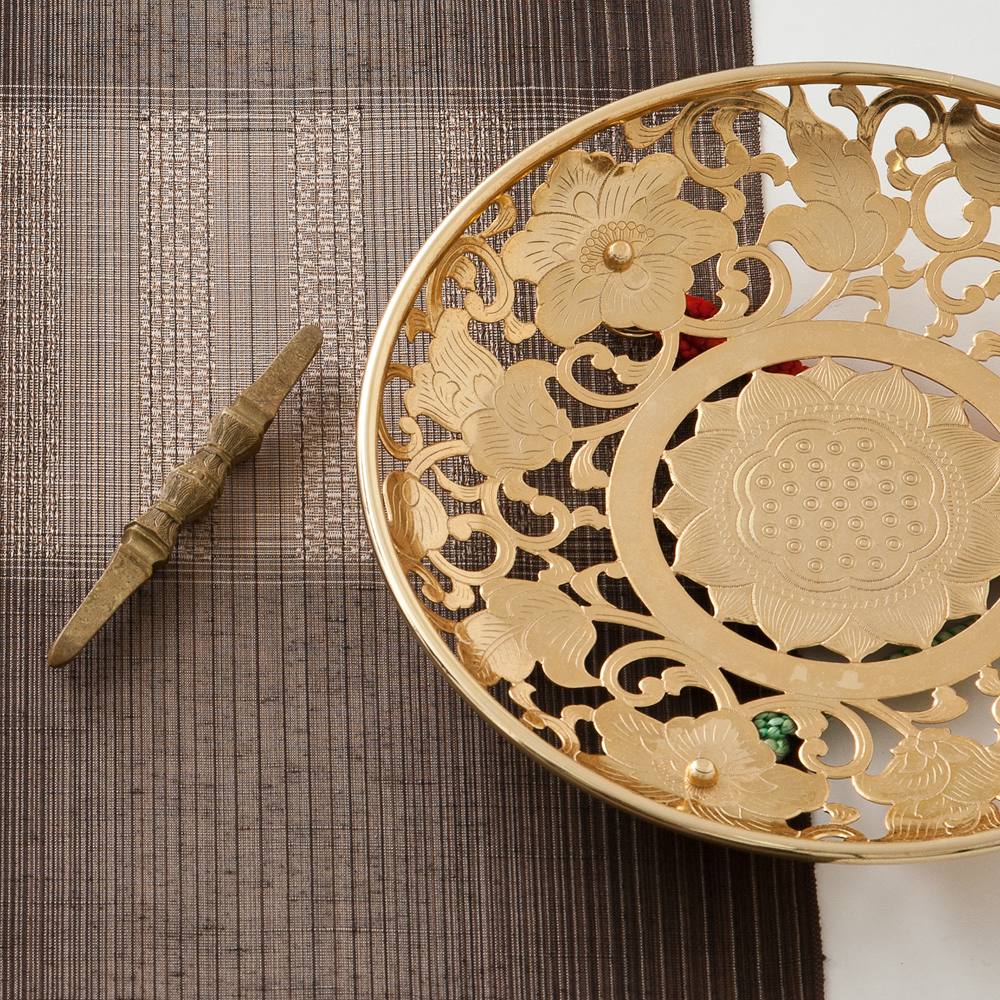 独鈷とは、仏具で硬いダイヤモンドをも打ち砕く武器でもあります。そのため煩悩を打ち砕き、悟りの道を決心する象徴とされています。この紋様は、独鈷を砂の上でコロコロと回転させた回転紋様となっており、その軌跡を紋様としています。回転することで、輪廻転生や巡り廻る宇宙の構造を表す祈りの紋様とも言われています。加えて、親子縞と孝行縞という親子がお互いを思う尊い心も織り込まれており「独鈷と華皿紋様」と呼ばれていました。