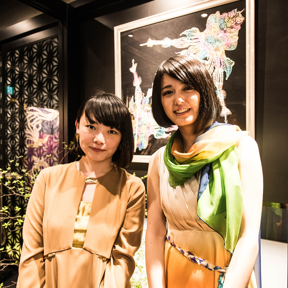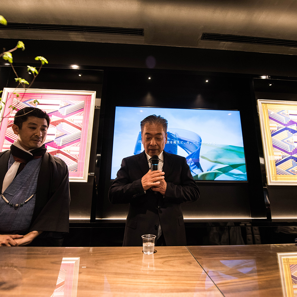 1 小松美羽さん・社主岡野(以下敬称省略) レセプションパーティーの中で、GINZA SIX限定販売の「美しい羽02 GINZA MADARA」の誕生秘話とOKANO銀座旗艦店出店の想いをトークショー形式でお伝えしました。