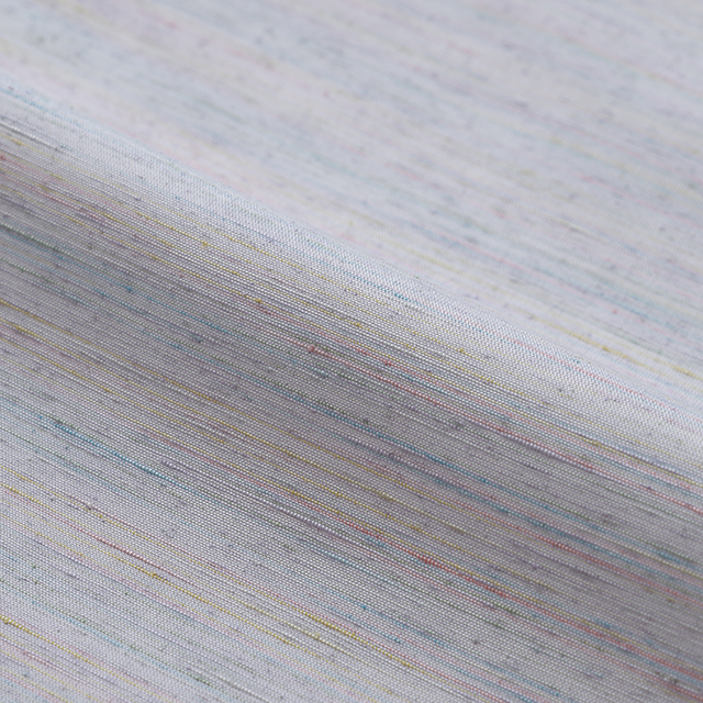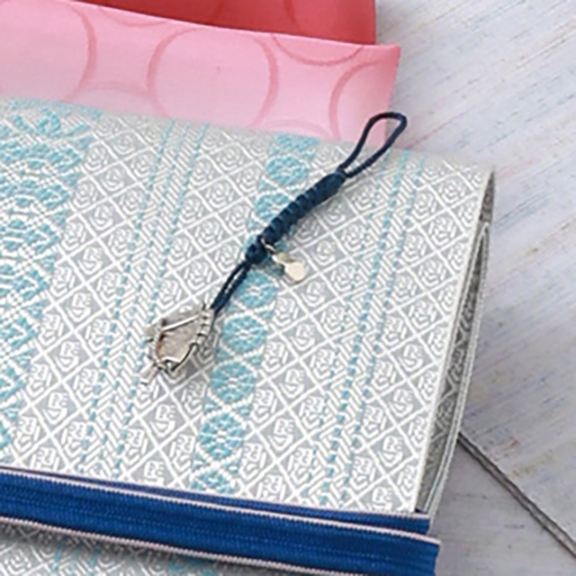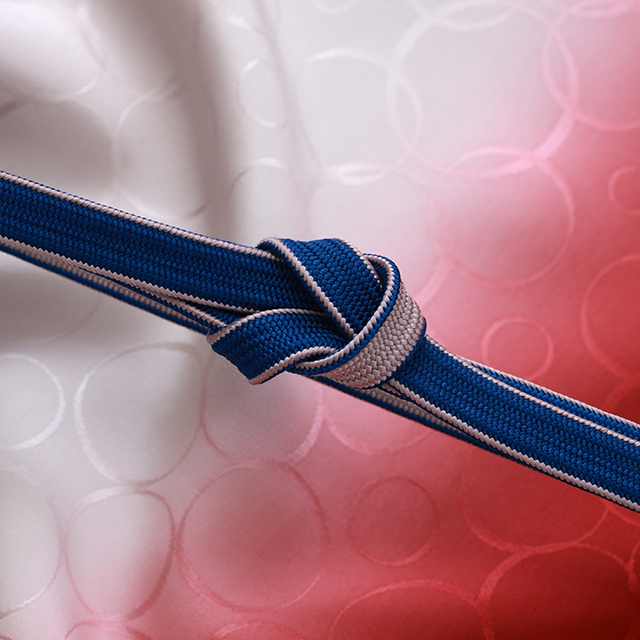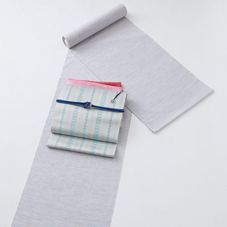 きものは、紅花で糸を染色して織った絹織物である紅花紬をセレクト。主に山形県米沢市で織られ、落ち着いた色柄が多い紬の中においては優しく華やかな紬です。合わせる博多帯は、伝統的な献上柄と干支を掛け合わせた「干支献上 午 五献上」。献上柄の中に魔除けのお守りとされる<蹄鉄>と、希望や幸運・純潔の象徴される<ユニコーン>を織り込んだ五献上です。小物は、冷たい空気と紅葉の秋景色をイメージして、赤の帯揚と青の帯締を合わせました。