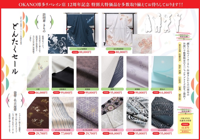 2012年春に博多リバレインに出店させていただき、おかげさまで12年目を無事迎えることができました。お客様をはじめ、染織メーカー・問屋さんなど多くの方々に支えていただき、感謝申し上げます。この度は久しぶりにどんたくの開催に併せて、「12周年記念 どんたくセール」を開催いたします。全国のメーカー・問屋さんより、珍しい商品やお得なご奉仕品などをご用意。皆様のご来店を心よりお待ちしております。