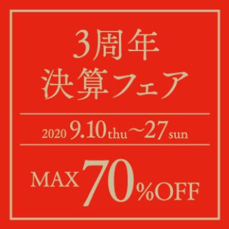3周年・決算フェア皆様のご愛顧のおかげで、OKANOは今年も9月に本決算を迎えます。そこで、日頃の感謝の気持ちを込めて「決算フェア」を開催!店頭在庫処分品や博多本社の直送品をはじめ、提携メーカー・問屋等の特別大特価品などをご用意いたします。4月に開催を見送った「GINZASIX店 3周年記念フェア」も兼ねた特別なフェアです。皆様のご来店を心よりお待ちしております。