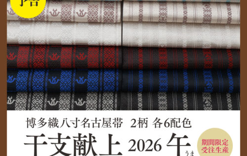 【御礼】受付終了いたしました!たくさんのご注文ありがとうございました。来年の干支献上(未)にもご期待ください。 いよいよ11月1日(土)より、干支献上 名古屋帯「午」の受付がスタート!2026年は「五献上」「変わり献上( … 続きを読む 【お知らせ】干支献上2026年 午<11月1日(土)> 受付スタート!