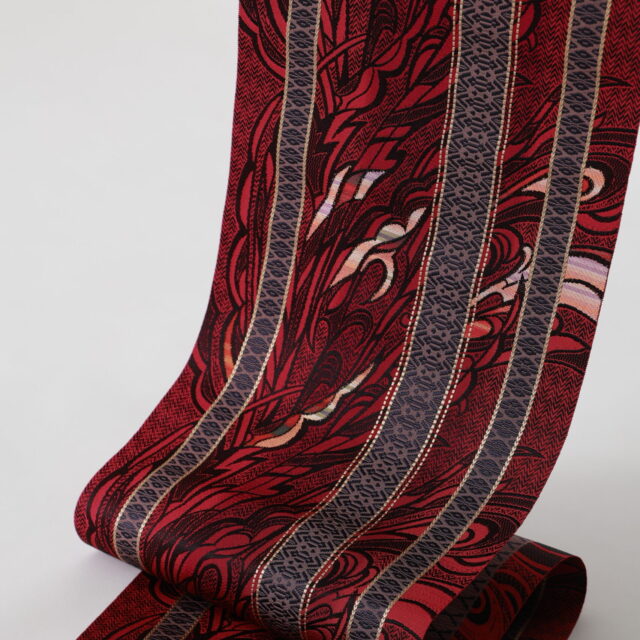 博多帯の朱雀華炎(すざくかえん)は、OKANOの2026年のテーマ「丙午(ひのえうま)」の作品のひとつ。博多織手織作家であり、伝統工芸士の近藤啓子さんが織り上げた手織りの名古屋帯です。