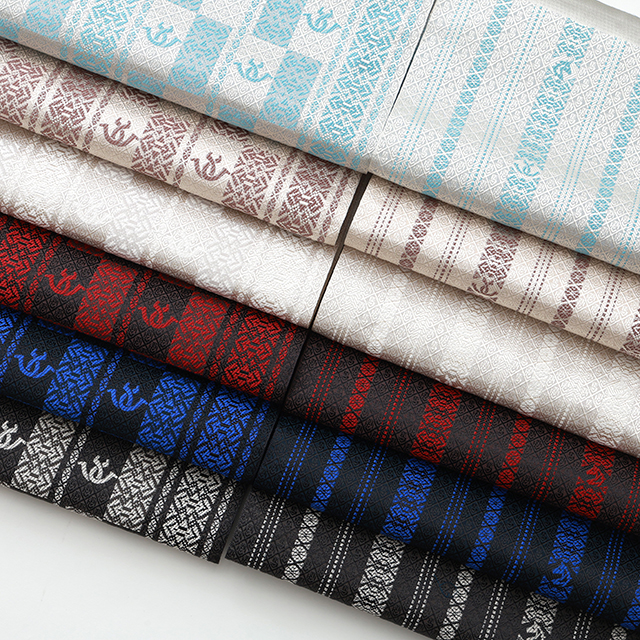 博多織の象徴である独鈷・華皿柄に「蹄鉄」を織り込み、柄が途切れることなく続いて行くことから、繁栄の意味がある市松模様にアレンジした変わり献上。