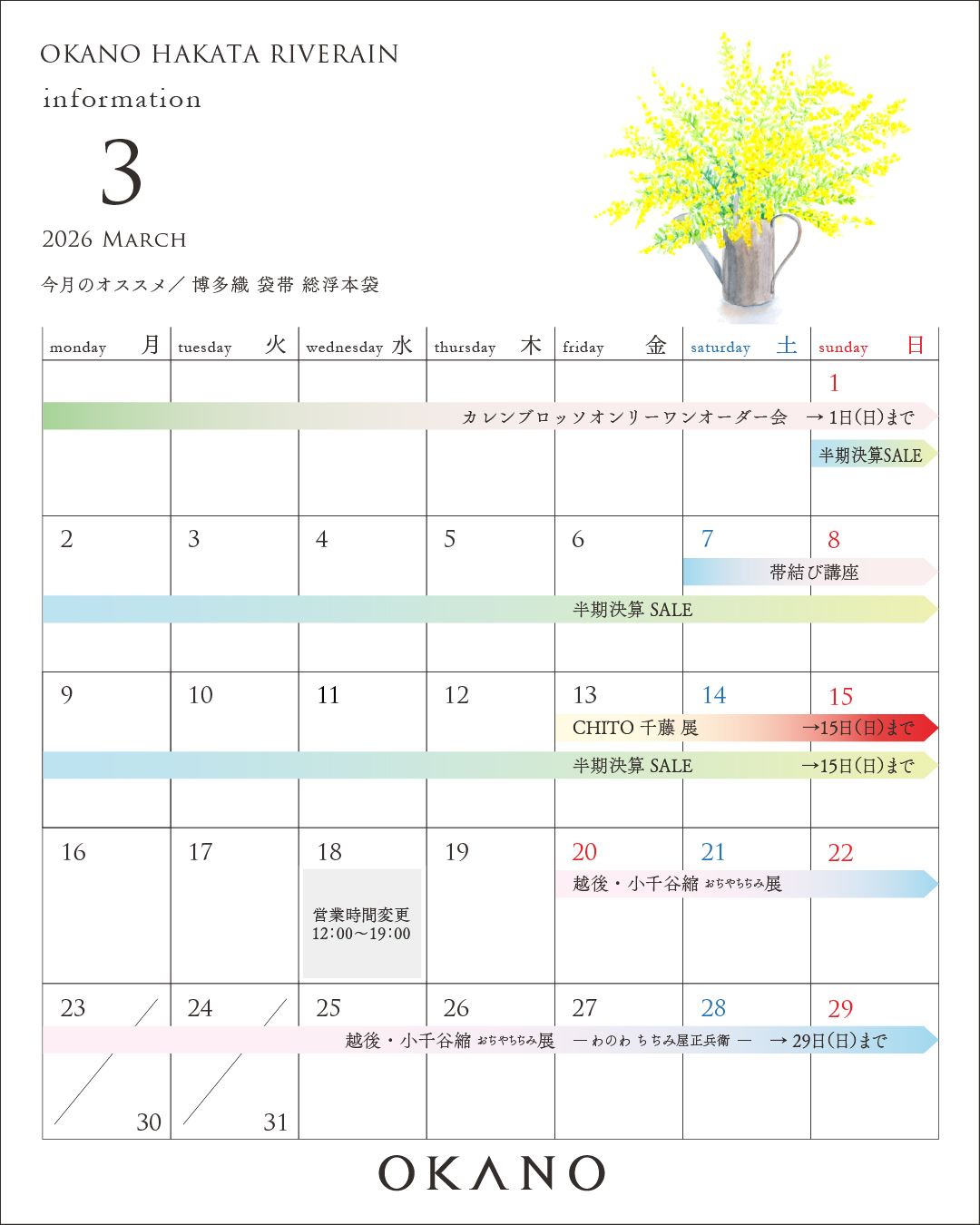 OKANOは、創業1897年の博多織元。地元で博多織をはじめ、全国の産地や作家の着物を紹介します。