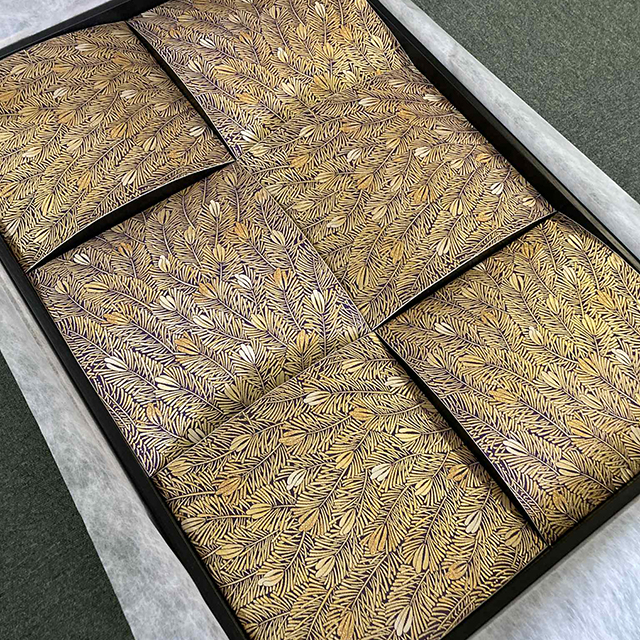 2025年11月18日に東京で行なわれた、企業家倶楽部様主催「企業家賞」の「企業家賞創設25周年記念授賞式」にて、授賞者の方へ贈呈される記念品の製作をさせていただきました。OKANOのアイデンティティでもある佐賀錦織の技術を使った、若松・流水のデザインをあしらった博多織の生地に、木工産地である福岡県大川市の(株)プロセス井口さんの協力のもと、パーツがそれぞれ浮かび上がる立体的なレリーフパネルを製作。パネルは、ジャパネットたかた創業者の髙田明氏と、エイチ・アイ・エス創業者の澤田秀雄氏へ贈呈されました。