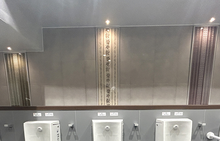 JR九州は、九州の玄関口「JR博多駅」のトイレのリニューアルプロジェクト“恋するトイレプロジェクト”「HEARTFUL JR KYUSHU」として、博多駅中央改札内トイレが2024年12 月にリニューアル。“博多らしさ”の地域性を表現するため、内装に博多曲物・博多織モチーフなどといった博多伝統の技が生きる工芸マテリアルを採用され、その内装にOKANOの織物が使用されています。